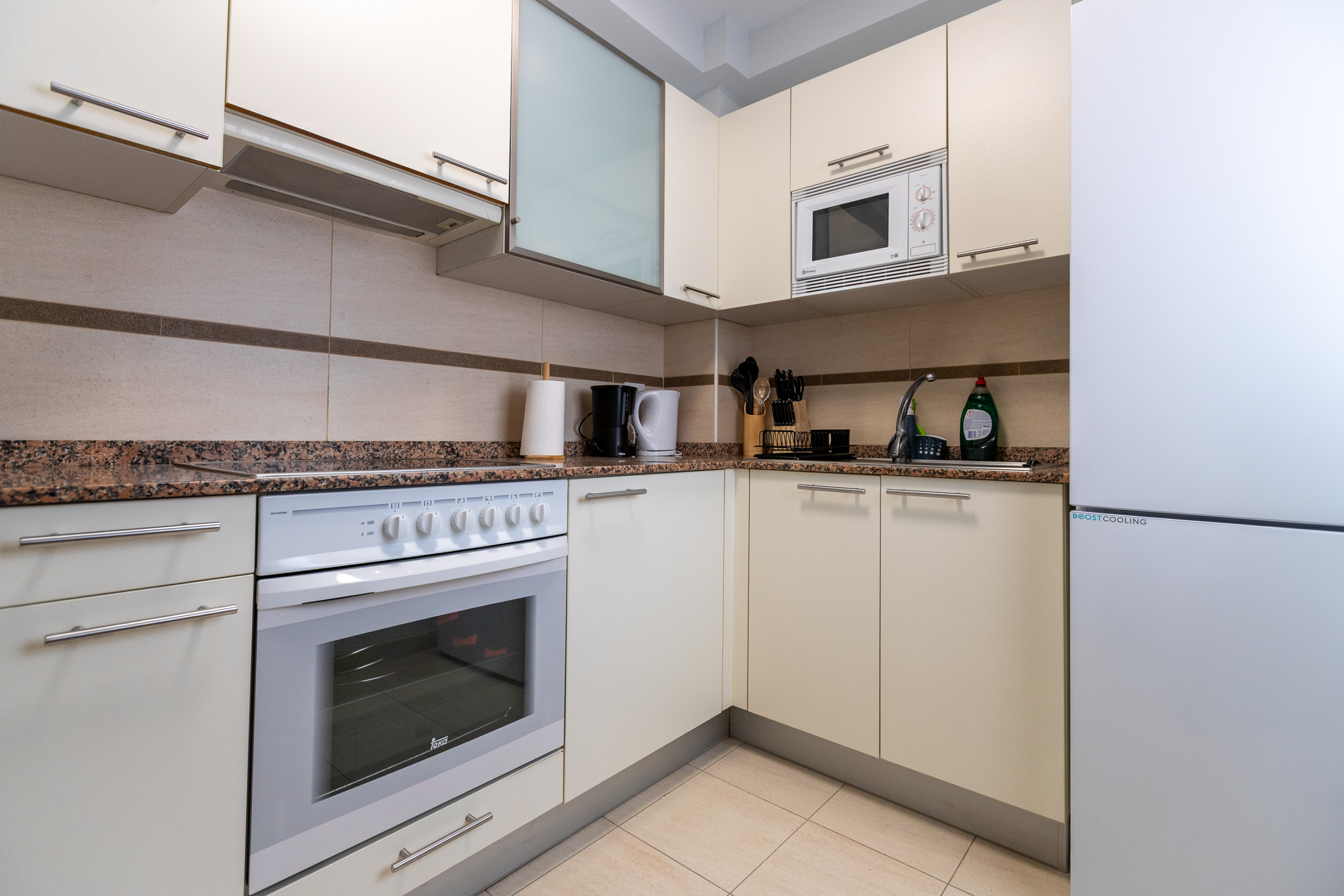 Die Küche ist komplett mit Haushaltsgeräten der neuesten Generation ausgestattet, einschließlich Kühlschrank, Waschmaschine, Geschirrspüler, Mikrowelle, Backofen, Kaffeemaschine und allen notwendigen Utensilien, um köstliche Mahlzeiten zuzubereiten. Darüber hinaus verfügt sie über eine praktische Sitzecke mit Fernseher.