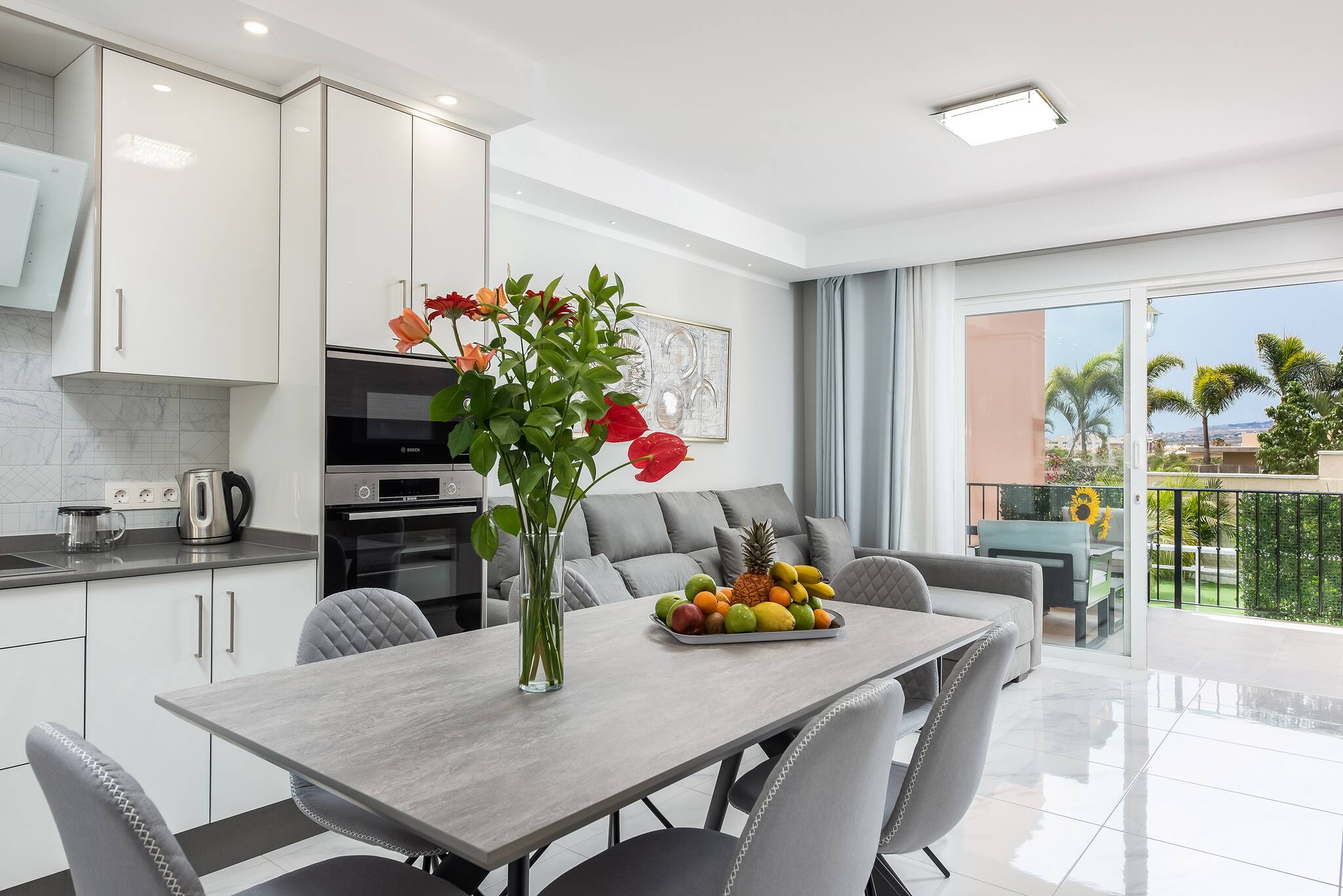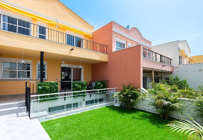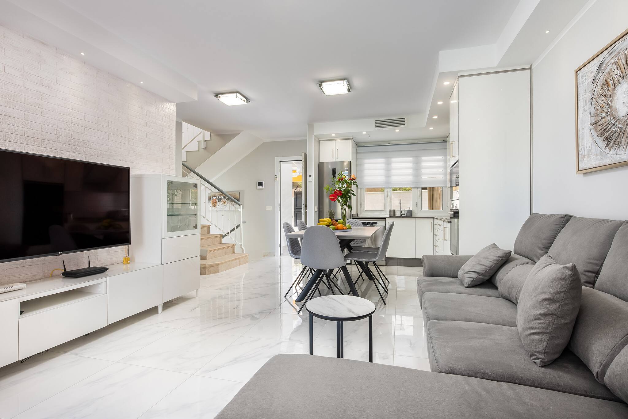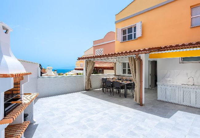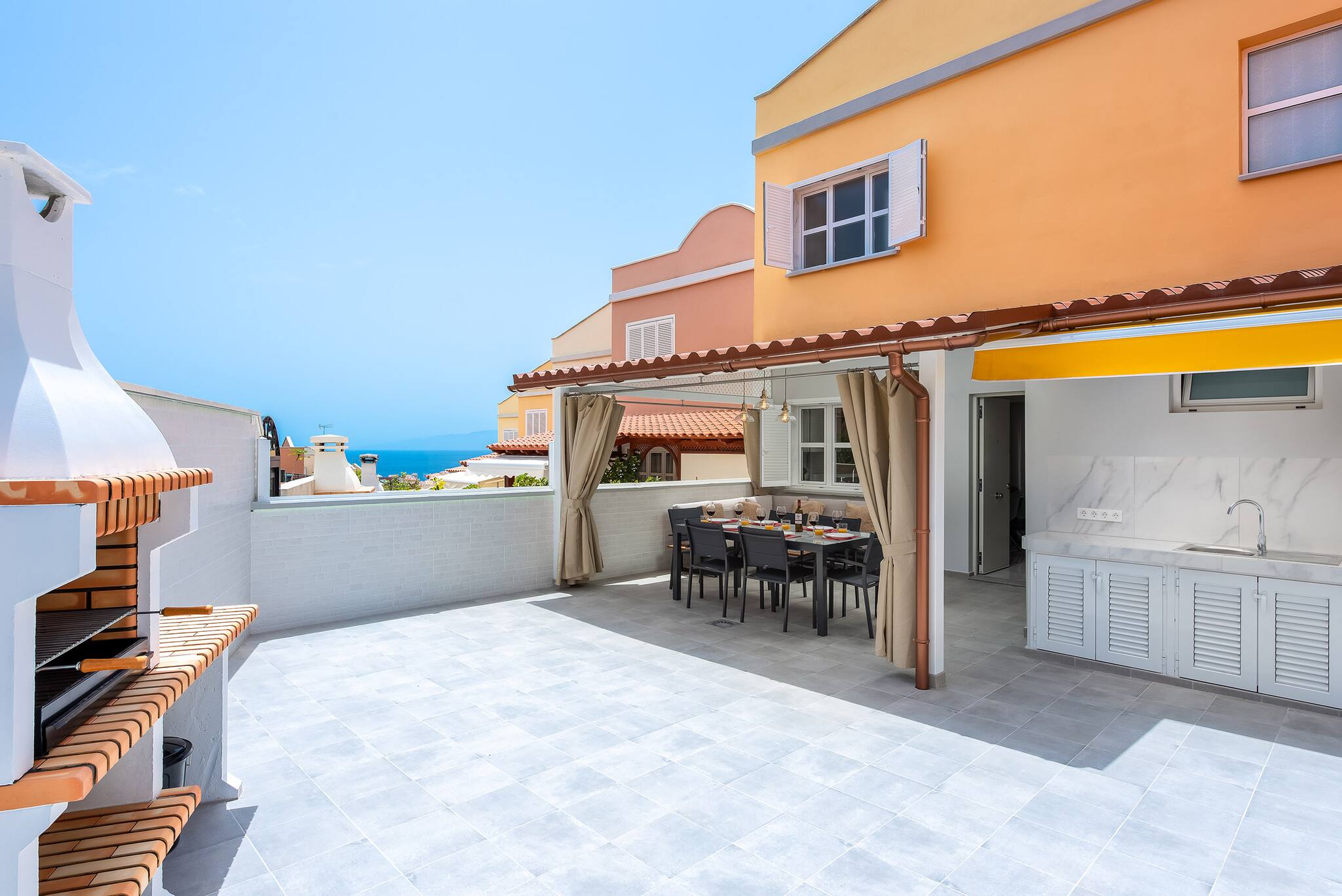 Wonderful terraced house with 4 bedrooms, 4 bathrooms, spacious living room, terrace with dining area, barbecue and stunning ocean views. The villa is new and furnished in a modern and comfortable style, located in a complex with 2 swimming pools, one for adults and one for children. WiFi is available in all areas, air conditioning. Located in a quiet area, 2 minutes walk from the Gran Sur shopping centre. The beach is 5 minutes by car.