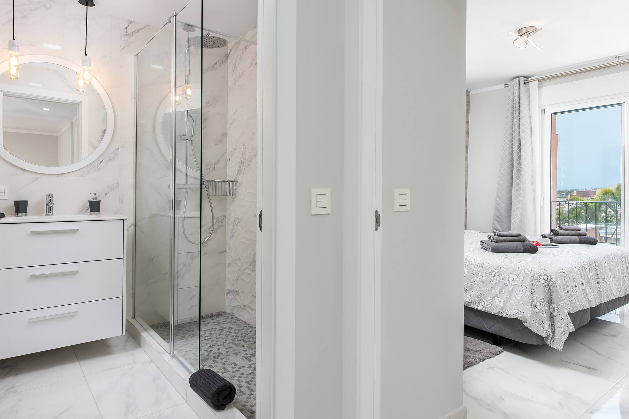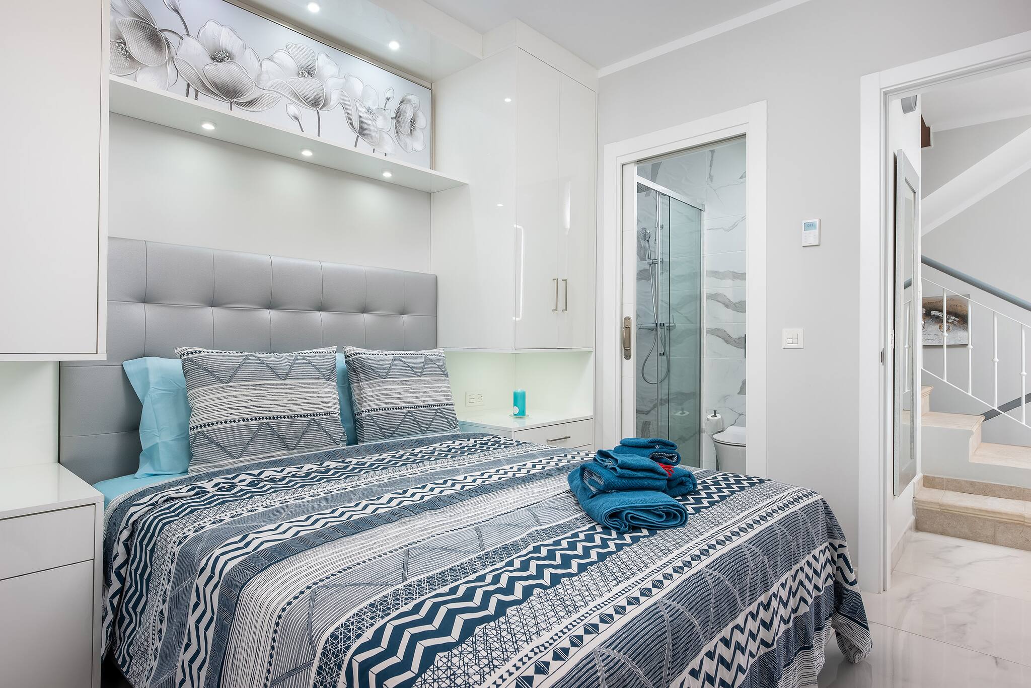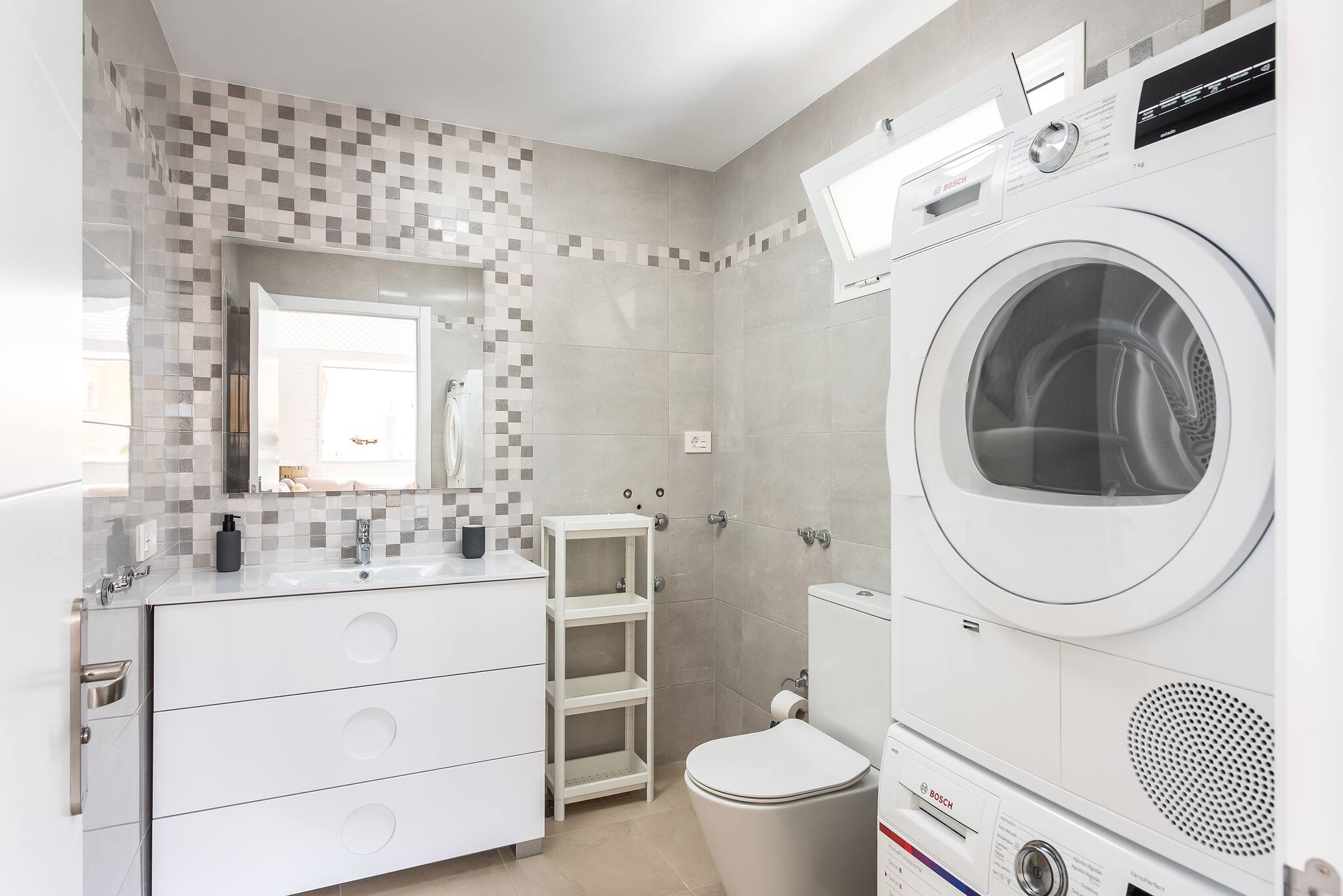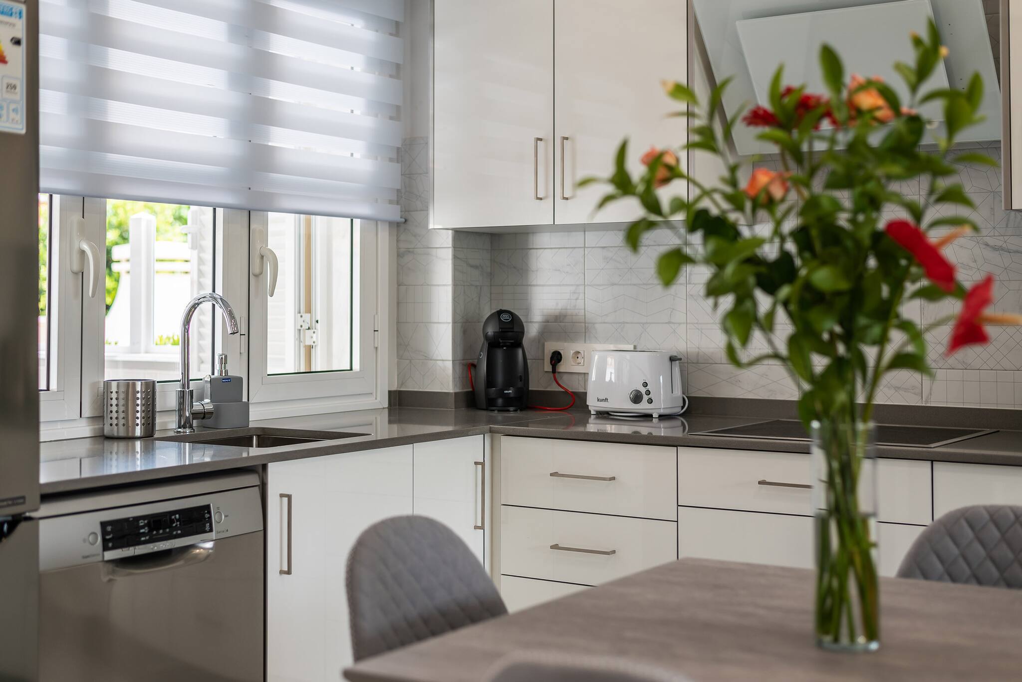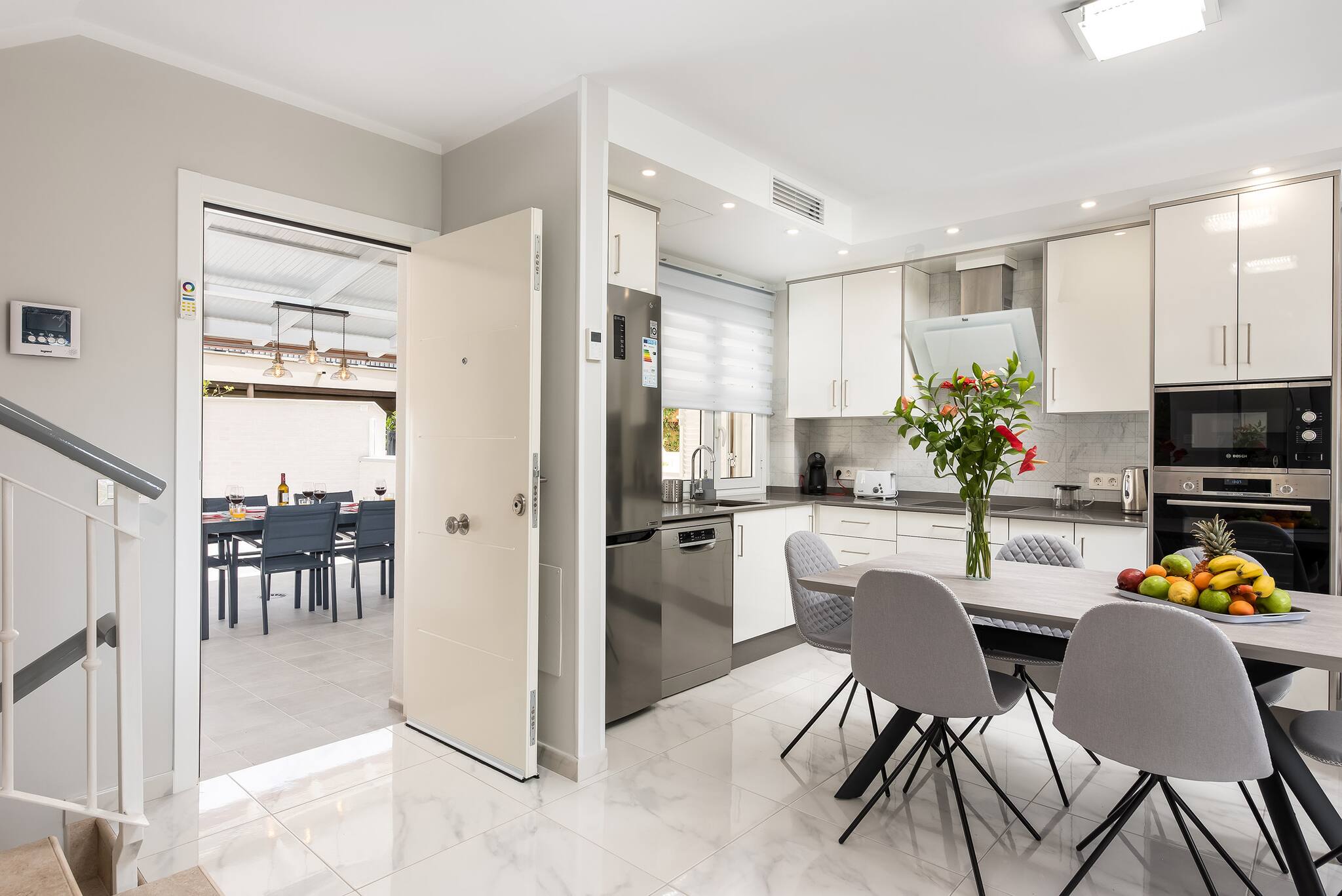 This villa is built on three levels and is distributed as follows: in the basement there is a spacious garage for two cars and a private one-bedroom apartment with kitchen and bathroom. On the first floor there is a large independent kitchen equipped with all appliances including dishwasher, a toilet, spacious living-dining room with access to the spacious terrace, which has a large outdoor dining area with barbecue, from where you can enjoy the sea view. There is also a bedroom with bathroom on this floor. Upstairs there are two bedrooms with spacious terraces and two bathrooms. There is WiFi and air conditioning in all areas.