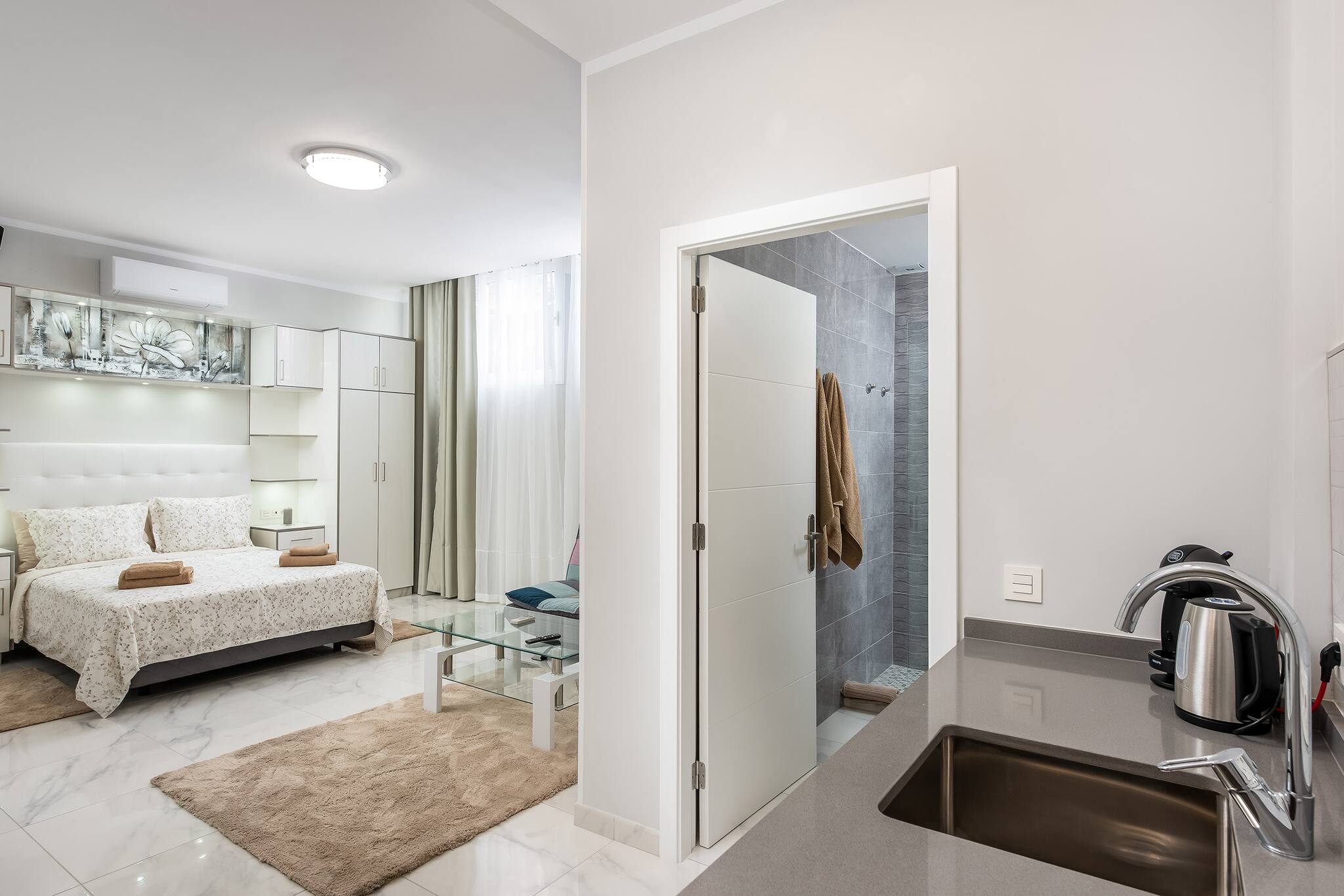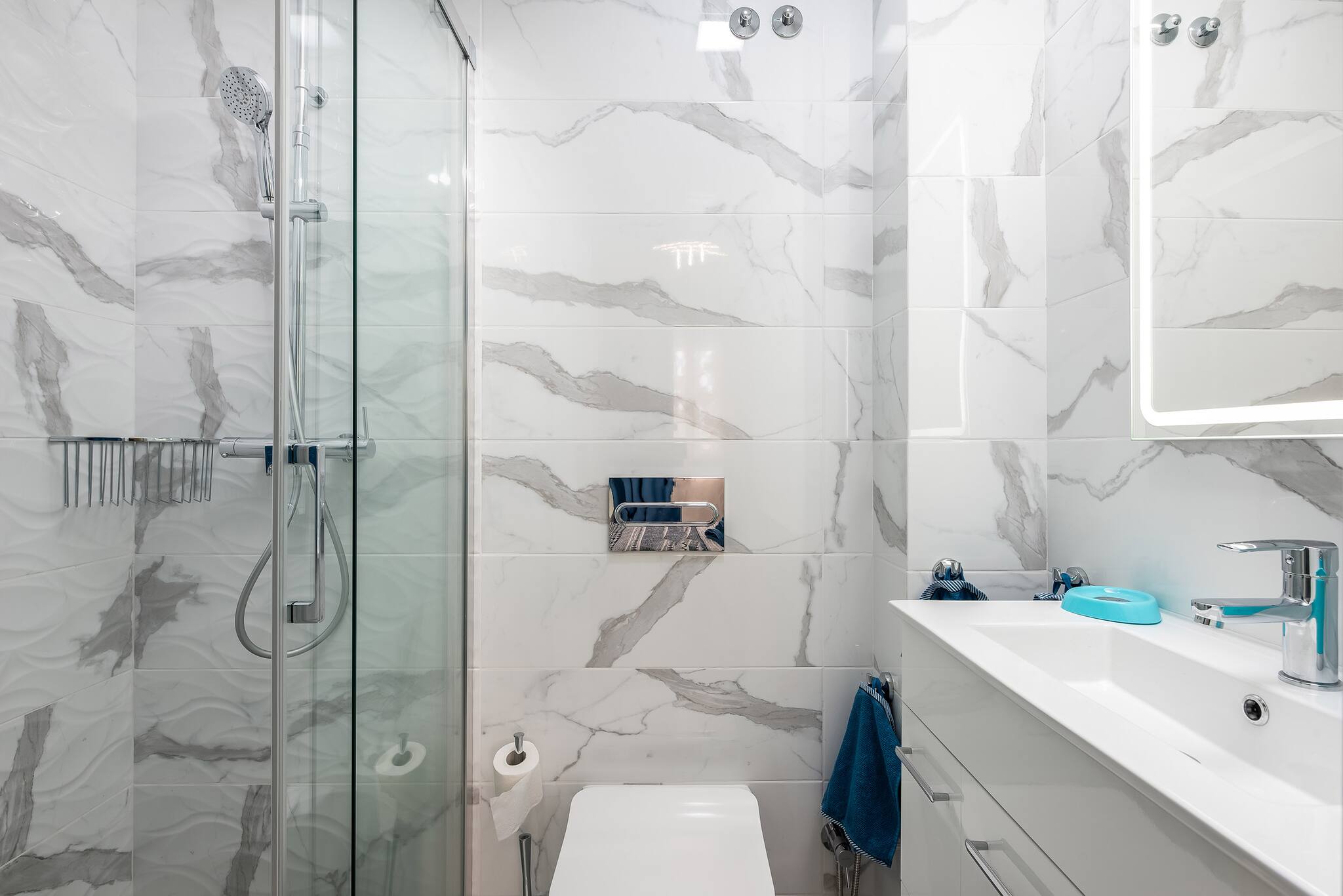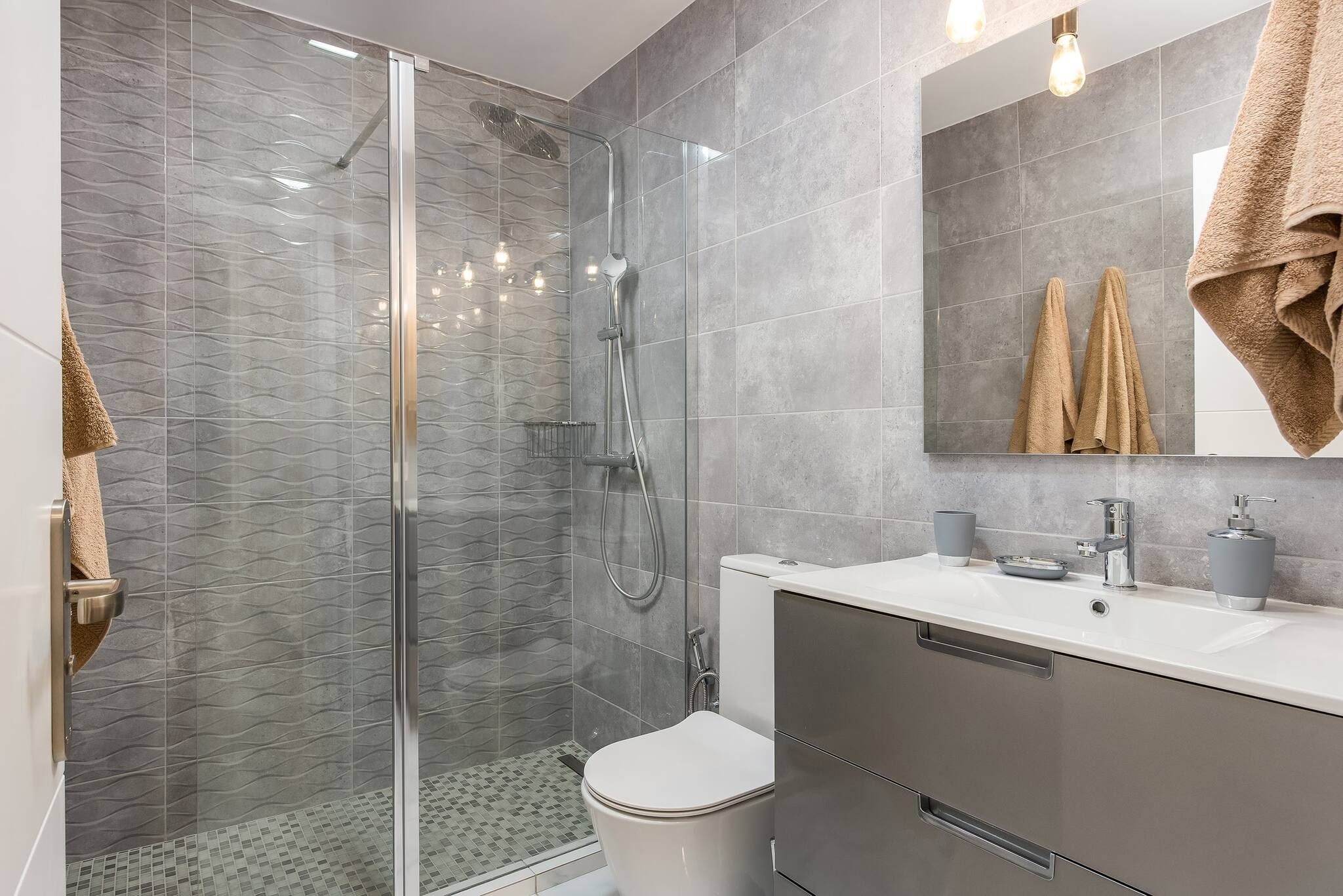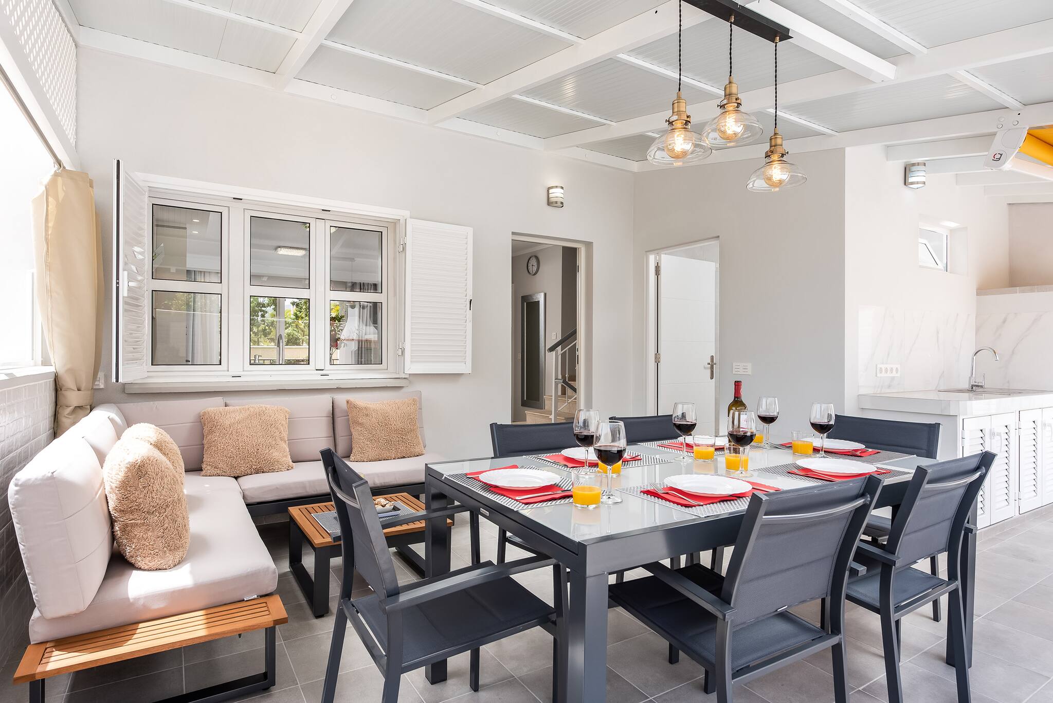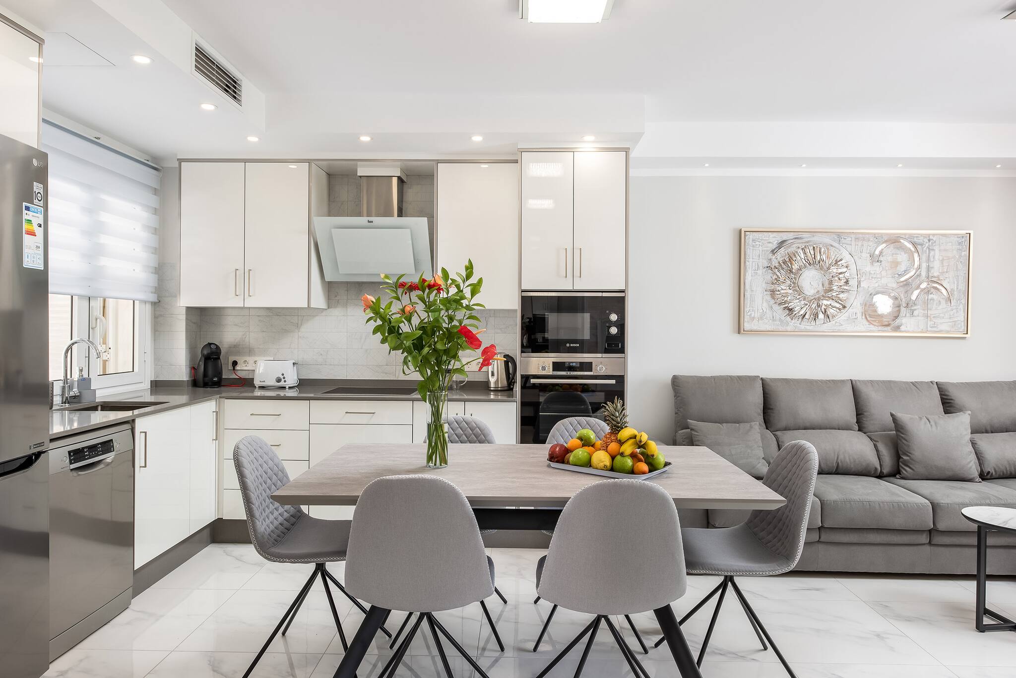 This villa is built on three levels and is distributed as follows: in the basement there is a spacious garage for two cars and a private one-bedroom apartment with kitchen and bathroom. On the first floor there is a large independent kitchen equipped with all appliances including dishwasher, a toilet, spacious living-dining room with access to the spacious terrace, which has a large outdoor dining area with barbecue, from where you can enjoy the sea view. There is also a bedroom with bathroom on this floor. Upstairs there are two bedrooms with spacious terraces and two bathrooms. There is WiFi and air conditioning in all areas.